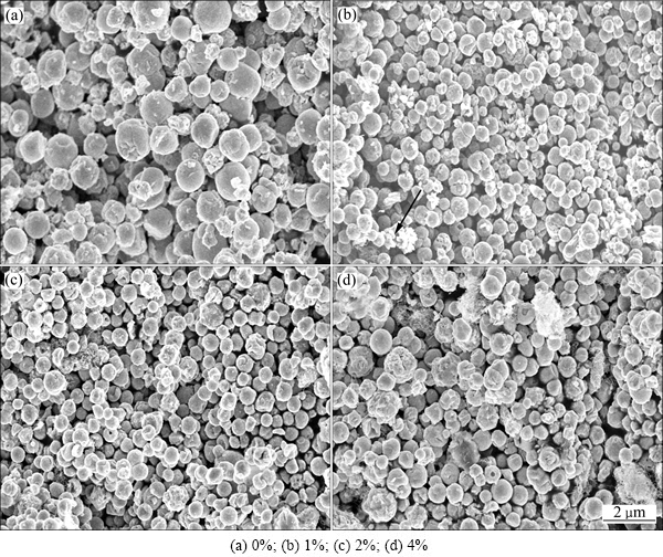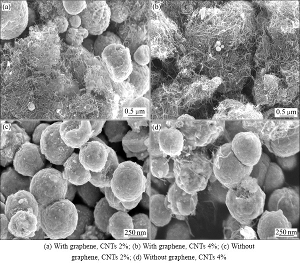 FAN等[13]已证实CNTs与GO质量比为10:1时,CNTs的分散效果较好,故本研究中固定CNTs与GO的质量比为10:1。而为了比较不同CNTs-GO复合物含量对复合球形貌的影响,本实验中通过改变CNTs-GO复合物的含量地行了以下比较实验,其结果如图5所示。从图5(a)可看出,未添加CNTs-GO时,复合球直径大小极不均匀。当CNTs-GO含量为1%(见图5(b))时,复合球直径明显变小,粒径分布也变窄,主要集中在400~800 nm,但颗粒间存在融合现象且出现了如箭头所示的CNTs团聚。当继续提高CNTs-GO含量至2%时,复合球粒径趋向更均匀,复合球直径大致集中在600 nm左右,且CNTs分散性也更好,无图5(b)所示的明显CNTs团聚现象。然而,继续增加CNTs-GO到4%(见图5(d))时,又出现了如箭头所示的团聚现象。产生上述现象的原因是:当CNTs-GO含量较低时,能够作为有效的形核质点的数量不足以实现均匀形核,而当其含量过高时,CNTs-GO变得难以分散,使得铜的形核质点反而减少,导致局部颗粒增大。最终,只有CNTs-GO含量在一个合适区间时才会得到颗粒均匀效果。因此,认为在其他实验条件不变时,CNTs/GO的最佳含量为2%。