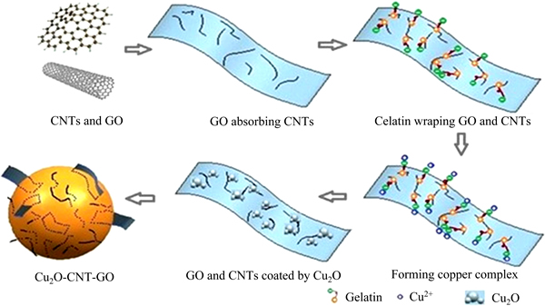 根据以上对Cu2O-CNTs-rGO复合球制备的工艺研究,提出了其形成的机理图,其结果如图7所示。GO表面的大量亲水性含氧官能团使得它具有很好的水溶性,且GO与CNTs通过π-π键作用相互吸引,进而促使CNTs稳定地分散在含水介质中。而实验中添加的明胶由氨基酸组成,在水溶液中离解后带正电,而GO和CNTs表面的羟基和羧基等官能团离解后带负电,此时,由于静电力的作用,明胶的羧基和氨基很容易与铜离子络合。因此,在弱还原剂葡萄糖的作用下,氧化亚铜将在CNTs/GO的表面形核长大,最终形成CNTs穿插嵌入的Cu2O-CNTs-GO复合球。经过微波还原过程得到Cu2O-CNTs-rGO复合球。