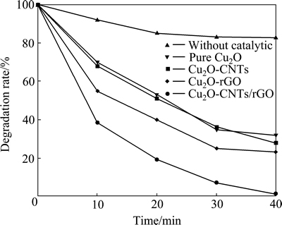 图8所示为在稳定其他实验条件的前提下分别以纯Cu2O、Cu2O-CNTs、Cu2O-rGO和Cu2O-CNTs-rGO作为催化剂时对甲基橙的降解率[14-15]。由图8可以看出,Cu2O-CNTs-rGO复合球显示了显著的可见光催化效果,仅40 min甲基橙降解率就达到99.8%。与此相对应,分别使用Cu2O、Cu2O-CNTs和Cu2O-rGO作为催化剂时,在40 min 后,甲基橙的降解率分别为67.9%、72.3%和77.6%,这充分说明Cu2O-CNTs-rGO在降解有色染料中具有更大的优势。