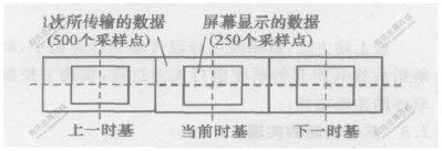 2.2 数据的分段与拼装示波器1次只能向计算机传输2屏共500个采样点。这2屏数据的确定是以示波器当前时基为准的,它们之间的关系如图1所示。
