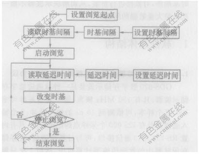 首先,是数据传输前的浏览功能。在数据传输前,有必要对数据进行全面浏览,以确定信号波形是否有效、要传输数据部分的起点和终点等。数据浏览功能的实现是通过定时改变数字存储示波器时基来实现,其过程如图3所示。