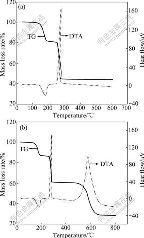 Fig.1 TG/DTA profiles of cobalt oxalate (a) and cobalt oxalate/graphite composite precursors (b) at heating rate of 5 ℃/min in air