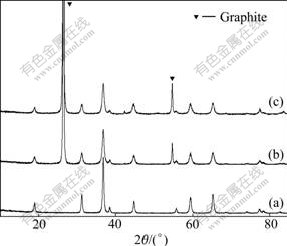 Fig.2 XRD patterns of pure Co3O4 and Co3O4/graphite composites: (a) Pure Co3O4; (b) Mass ratio of Co3O4 to graphite is 1:1; (c) Mass ratio of Co3O4 to graphite is 1:2