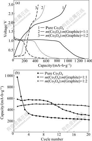 Fig.4 Initial charge/discharge curves (a) and cycling performance profiles (b) of pure Co3O4 and Co3O4/graphite composites