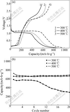 Co3O4/graphite composites synthesized at different temperatures are similar, but the capacity and the cycling stability are different. Discharge/charge plateau in high voltage range rises with increasing the calcination temperature. The Co3O4/graphite composites synthesized at 300, 400 and 500 ℃ deliver initial discharge capacities of 850, 884, 973 mA?h/g, and reversible capacities of 583, 658 and 725 mA?h/g, respectively. The capacity increase for the composites synthesized at higher temperature may be attributed to the higher crystallinity of Co3O4 and lower graphite content resulting from partial oxidation of graphite. As shown in Fig.7(b), the composites synthesized at 400 and 500 ℃ show greatly improved cycling performance compared with that at 300 ℃. The capacity retention ratios after 20 cycles for Co3O4/graphite composites synthesized at 300 and 500 ℃ are 50.6% and 92.0%, respectively. While Co3O4/graphite composites synthesized at 400 ℃ show the best cycling stability without capacity loss during the initial 20 cycles. This may be due to the preferable combination of good crystallinity and small particle size of Co3O4 for Co3O4/graphite composites synthesized at 400 ℃.