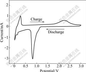 Fig.8 shows the cyclic voltammogram of Co3O4/ graphite composites synthesized at 300 ℃ and a scan rate of 0.1 mV/s, where the mass ratio of Co3O4 to graphite is 1:1. During the discharge process, a large cathodic current peak corresponding to the reduction (lithium intercalation) of Co3O4 appears at 0.8 V. And then the cathodic current increases with descending the potential of Co3O4/graphite composite to 0 V (vs Li+/Li), which is due to the lithium intercalation into the graphite. Two anodic current peaks at around 0.2 and 2.2 V are observed in the charge process, which correspond to the lithium deintercalation from the lithiated graphite and Co3O4, respectively. The two couples of redox peaks are consistent with the voltage plateau in the discharge/discharge curves.