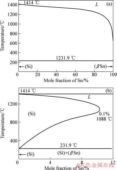 综上所述,熔析精炼提纯方法仍然存在众多问题需要解决,尤其是精炼提纯后如何实现硅晶与介质的高效分离问题。针对上述问题,本文作者提出在熔析精炼的过程结合定向凝固热场控制的思路,选择在Si-Sn熔析体系下,采用定向凝固的方法,通过控制合金体系硅的定向生长,重点研究硅与金属熔剂的有效分离,同时探讨定向凝固过程中杂质的提纯效果。