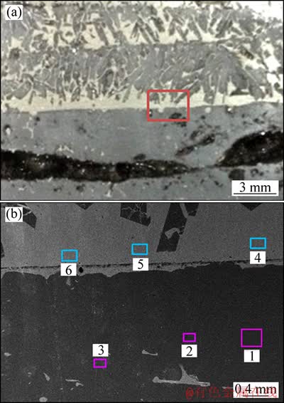 图4所示为Si-94%Sn(质量分数)合金熔析精炼后的剖面图[17]。图5所示为Si-Sn合金定向凝固后所得硅锭顶部的剖面图和SEM像。由图4可知,由于没有对熔析精炼凝固过程进行有效控制,造成树枝状硅弥散分布在硅锭的各个位置,即Si中有Sn、而Sn中有Si,进而导致Si与金属熔析剂难以分离。由图5可知,由于Si-Sn熔析精炼过程中采用了定向凝固的方法,在硅锭的顶部可明显看到生成了一条平坦稳定的相界面分界线,上部是Si-Sn合金,下部是Si相,Si-Sn合金相与Si相之间有明显的相界面,实现了很好的分离。MA等[18]的研究表明,在同样的温度梯度和下拉移动速率下,由相图知,随着硅含量的增加,相界面将变得更加稳定和平缓。然而在快速下拉的条件下,Si在定向凝固过程生成大量的片状硅晶,不利于生成稳定平缓的相界面分界线。
