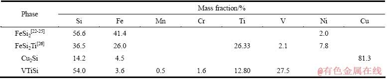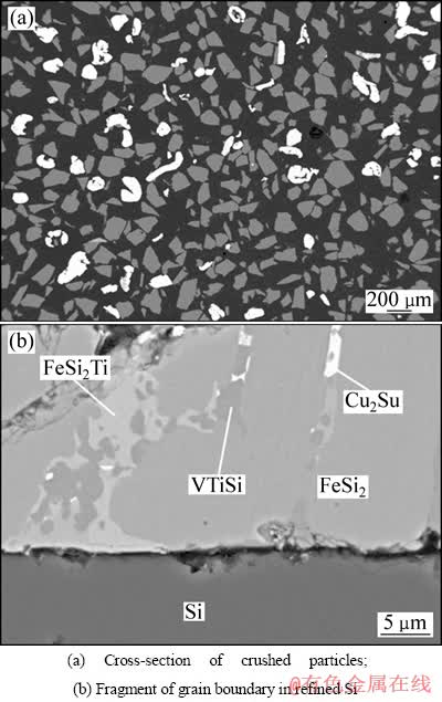 为进一步说明复合过程对杂质提纯的效果,图7(a)所示为Si-55%Sn的合金定向凝固后所得硅锭破碎分级后硅粉(74~150 μm)的SEM像。由图7(a)可知,颜色较深(灰色)的是Si相,颜色较亮(白色)的是金属Sn相,Si相和Sn相是单独分开的,没有出现Sn相包裹或夹带Si相,且之前Si相中夹带的Sn相也基本消失,从而为酸洗除Sn提供了有利条件。图7(b)是Si中杂质相的SEM像。由图7(b)可知,杂质相与Si相之间有明显的分界线。在熔析体系下,由于金属杂质的分凝系数较在纯硅体系下的分凝系数小(见表4[18]),在定向凝固的过程中,杂质相从Si基体中偏析到硅晶界,所以硅相中很少有杂质相存在。杂质相与Si相之间的有效分离为金属杂质的去除提供了有利条件,硅料酸洗的结果也验证了此结果。通过能谱分析可知(见表5),杂质相主要是FeSi2[22-25]、FeSi2Ti[26]、Cu2Si和VTiSi。在混酸体系下,偏析到硅晶界的杂质相能够得到很好的去除。在杂质相和硅相中都没有发现Sn相的存在,进一步表明熔析剂Sn可以通过定向凝固与Si实现有效的分离。而非金属P含量由定向凝固前的50.12×10-6降为8.48×10-6。MIN等[27]和MORITA[28]发现,Ca对P具有很大的亲和力,P可能与Ca形成杂质相,然后通过酸洗去除。由此可以推断出,P在定向凝固过程与金属杂质形成新的杂质相被熔析剂捕获进入熔析剂中,从而获得较好的去除效果。因此,在Si-Sn熔析体系下,P可以与金属杂质Al、Ca、Mg和Si形成新的杂质相[29],随着金属杂质偏析到晶界,然后通过酸洗实现去除。