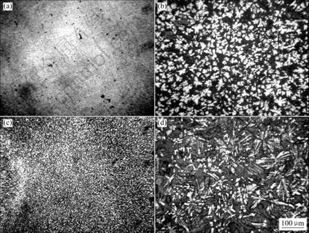 Fig.1 Microstructures of Mg65Cu25Y10?xNdx samples with diameter of 3 mm: (a) x=6; (b) x=2; (c) x=8; (d) x=10