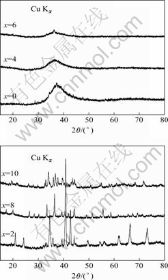 图2所示为Mg65Cu25Y10?xNdx(x=0, 2, 4, 6, 8, 10)不同成分合金试样的X射线衍射谱。