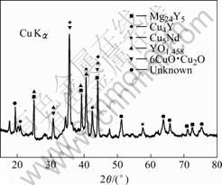 对于x为2, 8, 10成分的合金,X射线衍射谱除部分散射峰外具有较为明显的晶体衍射峰特征(见图2(b)),说明在本研究条件下,这一尺寸所获得的样品尚不能够形成完全非晶相。经过分析,这几种合金中含有Mg24Y5、Cu5Nd和Cu4Y等晶体相以及6CuO?Cu2O和YO1.458等氧化物。图3所示为x=8合金的X射线衍射分析结果。由图3可见,在Mg-Cu-Y合金中添加Nd后,这几种合金中增加的合金相为Cu5Nd。