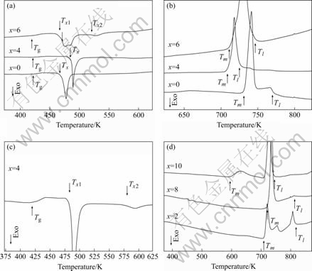 Table 1 DSC analyses results of Mg65Cu25Y10?xNdx(x=0, 2, 4, 6, 8, 10) samples at heating rate of 20 K/min