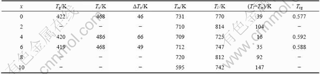 表1 Mg65Cu25Y10?xNdx(x=0, 2, 4, 6, 8, 10)合金试样DSC分析结果(加热速率20 K/min)