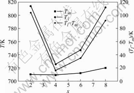 Fig.5 Relationship among Tm,Tl and (Tl?Tm) and alloys compositions of Mg65Cu25Y10?xNdx (x=2, 4, 6, 8)