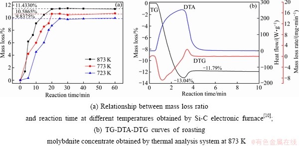 本文对723K、773K和873 K下辉钼精矿在不同反应时间反应前后的质量分别进行了称量,按式(3)对其质量损失率进行计算,得出不同反应条件下辉钼精矿的质量损失率曲线,结果如图1(a)所示[10]。