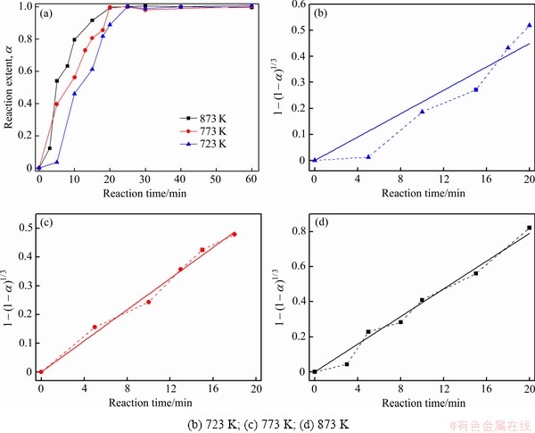 Fig. 2 Relationship between reaction extent with reaction time at different temperatures(a) and relationship between value of 1-(1-α)1/3 and reaction time at different temperatures((b)-(d))