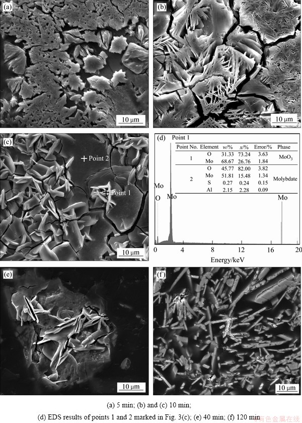 2) 辉钼精矿焙烧成三氧化钼的过程中伴随着少量中间产物二氧化钼的生成,产物形态由颗粒形状逐渐转变成片状结构,生成的最终产物具有一定的各向异性;并且发现辉钼精矿焙烧成片状三氧化钼的过程符合挥发-冷凝机理。