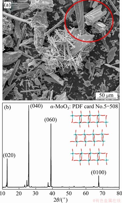 Fig. 4 Powder micrograph(a) and XRD pattern(b) of needle-like product obtained by roasting molybdenite concentrate at 873 K for 20 min
