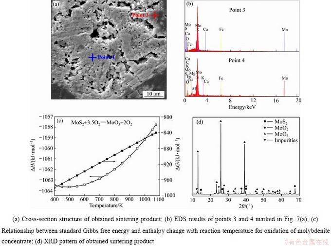 辉钼精矿在纯氧环境中焙烧至接近完全时,烧结现象也会随之发生,即部分产物会牢牢紧密地与坩埚底部结合在一起。温度越高,烧结现象越为严重[14-15]。在实际工业多膛炉焙烧过程中,烧结现象也会时常发生,以致多膛炉耙臂磨损严重,大大降低设备使用寿命[16]。因此,研究焙烧过程中产物的烧结行为对避免烧结现象的发生,减少不必要的设备损耗,降低经济损失尤为重要。为此,论文作者在前期工作[10]基础上,结合能谱结果和热力学数据继续对其烧结行为进行深入分析。