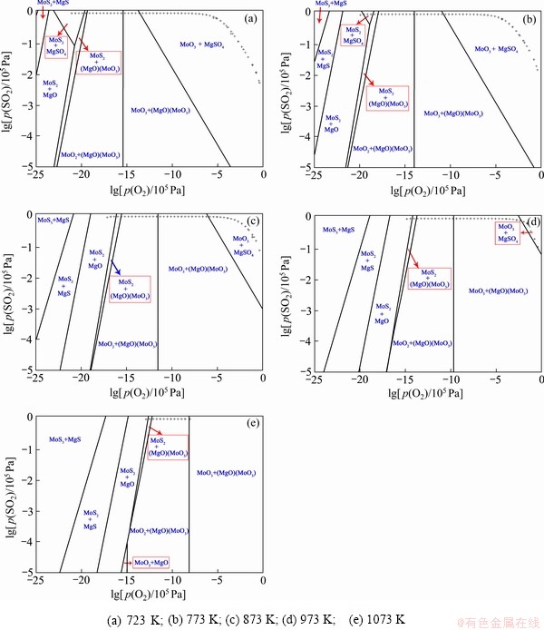 Fig. 8 Predominance phase diagrams of Mo-Mg-S-O quaternary systems at different temperatures (“+”=1.01×105 Pa)