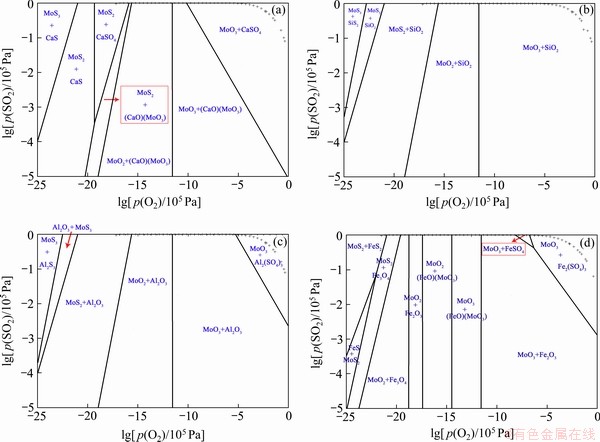 Fig. 9 Predominance phase diagram of Mo-Me-S-O quaternary systems at 873 K (Me represents Ca, Si, Al, and Fe) (“+”=1.01×105 Pa)