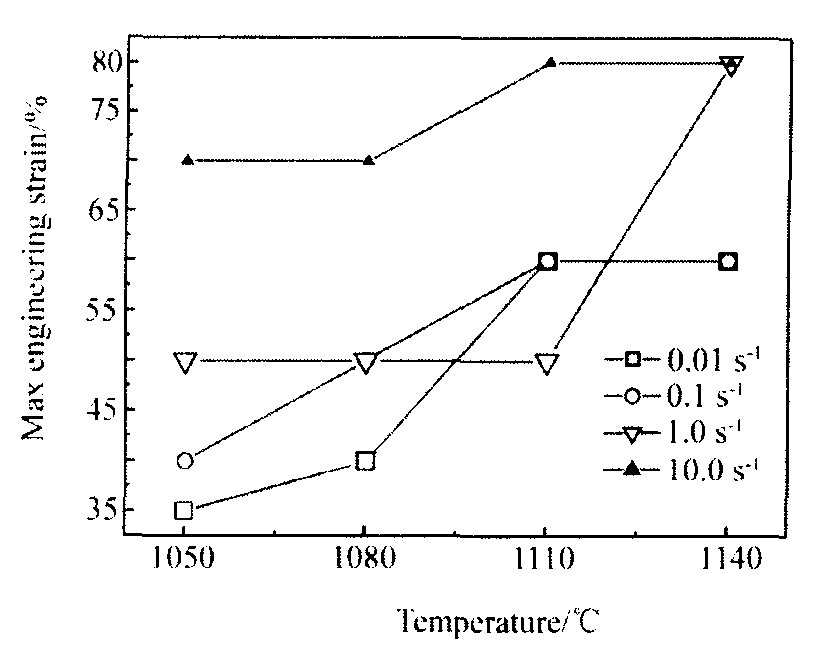 时, 试样表面也没有出现裂纹, 这说明变形温度和变形速率对材料的变形特性有明显的影响。 随着变形温度或应变速率的升高, 喷射成形高温合金更容易变形。 图1是喷射成形合金在不同变形温度、 应变速率时的塑性图, 纵坐标为无裂纹时的最大工程应变。 从图中可见, 喷射成形合金在高应变速率 (10.0 s-1 ) 条件下, 在所实验温度范围内具有其他应变速率条件下更好的变形能力。 这是与其他合金变形的不同之处, 按照一般规律, 在温度不变的条件下, 随着应变速率的增大, 材料的变形能力不好, 而喷射成形合金却相反, 分析认为这与快速凝固过程形成的组织特征有关。 喷射成形过程中, 在材料内部产生了大量的空位和位错, 加速了原子的扩散速率, 提高了合金的变形能力。 从图1可见本文研究的喷射成形高温合金最佳热变形条件为应变速率10.0 s-1 , 变形温度1050~1140 ℃, 或变形温度1140 ℃, 应变速率0.01~10.0 s-1 。 从提高生产效率和降低生产成本角度考虑, 低温高应变速率是最合适的。 这可以作为确定其热加工工艺的重要依据。