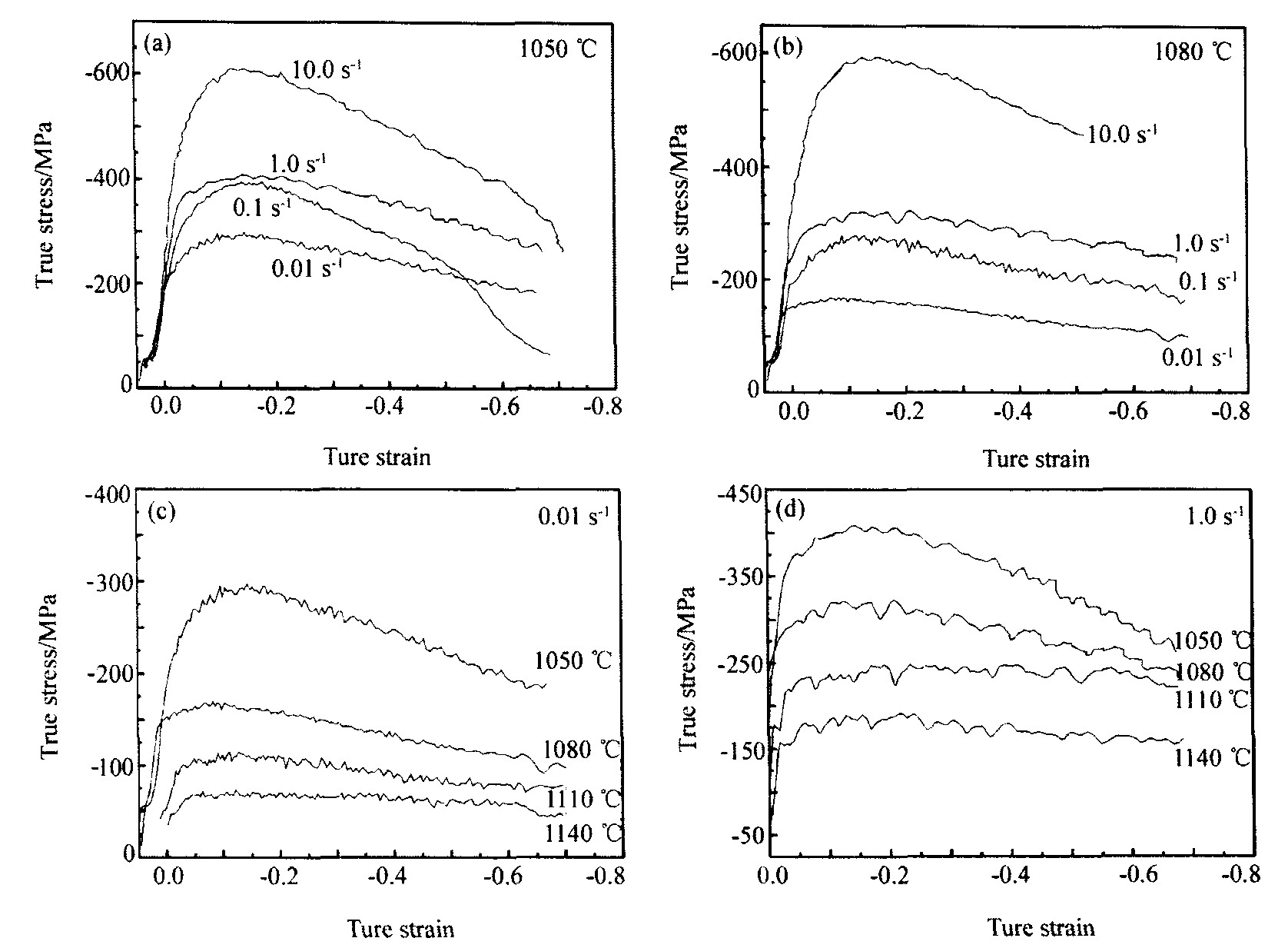(a) 1050℃; (b) 1080℃; (c) 0.01 s-1 ; (d) 1.0 s-1