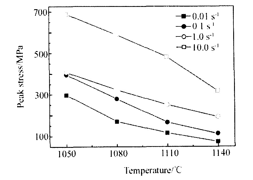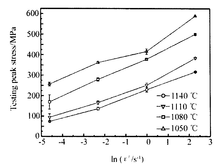 图3 喷射成形高温合金峰值应力与温度关系曲线