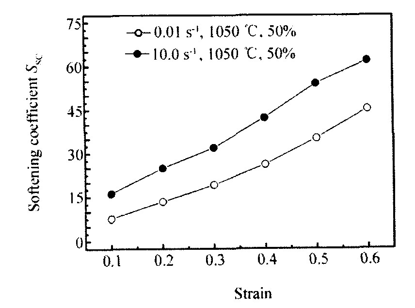 , 式中σ p 为峰值应力, σ i 为不同应变量所对应的应力。 从图中清晰可见, 在实验条件下随着应变的增加, 软化系数增大, 在相同变形温度下, 随着应变速率的增加, 软化系数增大, 这与图2及前面的分析结果一致。