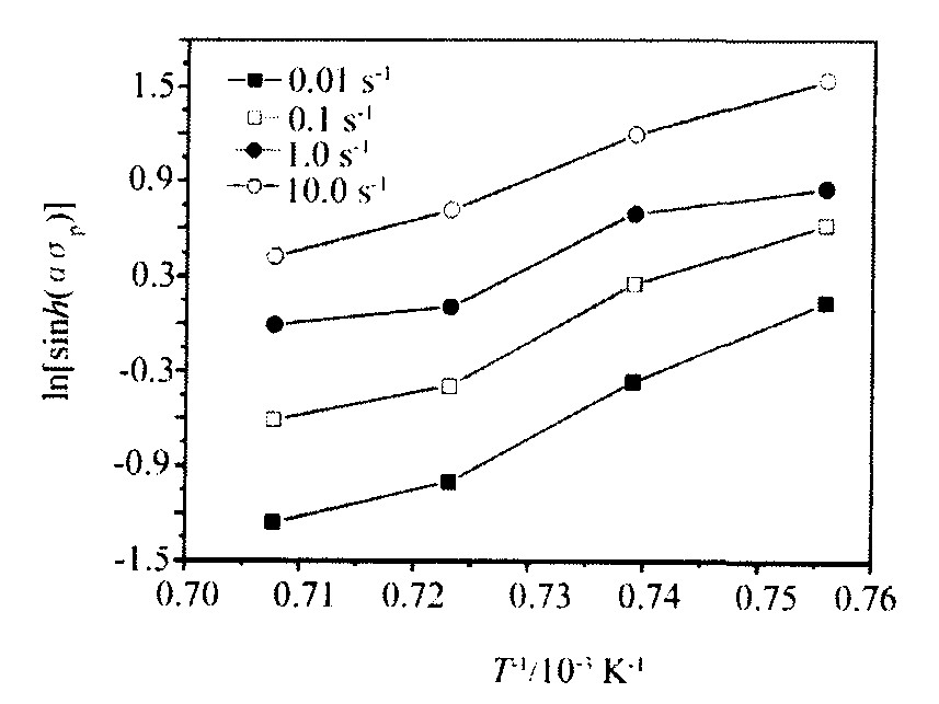 与ln [sin h (ασ) ]之间、 ln [sin h (ασ) ]与1/T之间的关系曲线, 从而确定出n和s值分别为4.396和25192.4, 所以激活能Q=Rsn=8.314×25192.4×4.396=920.74 kJ ·mol -1 。 本文所计算出的高温变形激活能值远大于纯镍的体积扩散激活能272.7 kJ ·mol -1