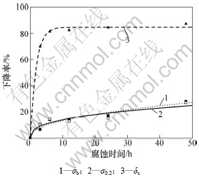 图1 7055铝合金板材拉伸性能下降程度与剥落腐蚀时间的关系