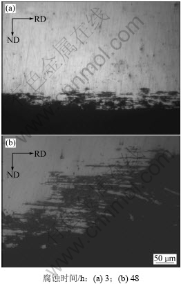 图3所示为7055铝合金板材剥落腐蚀后截面的金相照片。当腐蚀时间较短时,样品表层可观察到沿晶腐蚀迹象(如图3(a)所示),此时,腐蚀深度较小;随着时间延长,腐蚀不断地沿着晶界进行,深入到样品内部,同时,由于腐蚀产物膨胀产生的力将表层的金属顶起而呈层状脱落,如图3(b)所示。此外,由于腐蚀沿着晶界进行,将晶粒的形状衬托出来。