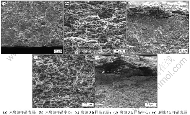 通过扫描电镜对样品的断口观察发现:在样品的中心部分,腐蚀对其断裂特征几乎没有影响,但在样品表层有较大的差别,典型的SEM照片如图4所示;对于未腐蚀样品,拉伸断口表层呈现出典型的准解理特征(见图4(a));而中心是典型的韧性断裂特征,以穿晶韧断为主,可观察到大量的韧窝(见图4(b));经过 3 h腐蚀后,样品拉伸断口从表层至中心可分成3个区域,如图4(c)所示。表层为沿晶断裂层,可观察到很多沿晶裂纹,显然为表层发生了腐蚀的区域;次表层呈现准解理特征,中心层仍主要是穿晶韧断,都与未腐蚀样品的表层类似;随着腐蚀时间的延长,表面的腐蚀层厚度不断增加(如图4(e)所示),不仅可观察到沿晶裂纹,还可观察到一些白色的腐蚀产物。