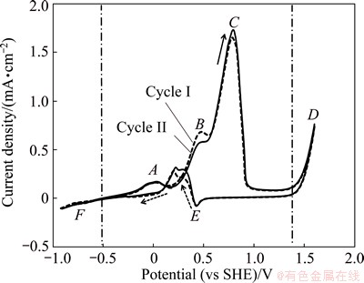 Fig. 1 Cyclic voltammetry of pure gold electrode in the first two cycles (I and II) without agitation in 0.04 mol/L NaCN solution under oxygen-free conditions at pH value of 10.5
