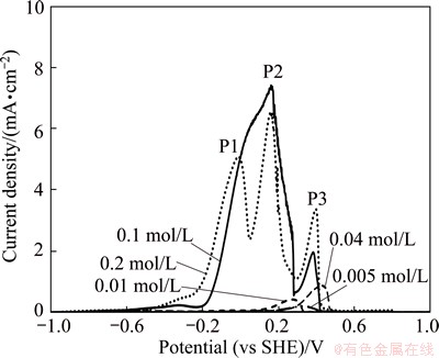 The peak current density (P2) is around 7.37 mA/cm2 in 0.1 mol/L NaCN while it is only 0.22 mA/cm2 in 0.005 mol/L NaCN. For instance, the peak current densities are observed around 4.94, 6.52 and 3.24 mA/cm2 in 0.2 mol/L NaCN for the consecutive three peaks in this work, while KIRK et al [15] observed almost 0.3, 10, 40 mA/cm2, respectively, with the same concentration of cyanide (0.2 mol/L). The first peak generally gives very low current density and sometimes is not observed. These results confirm the presence of three peaks and the differences in peak current densities can be linked to some experimental parameters, such as the magnitude of agitation and scan rate.