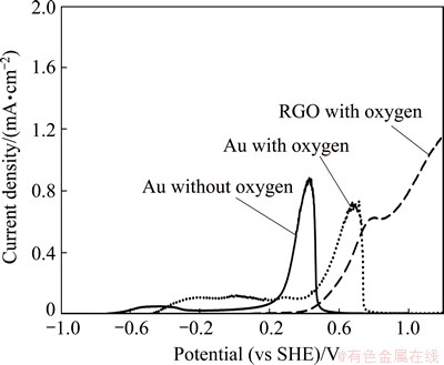 Since oxygen is essential for industrial cyanidation practice, it is quite important to examine the effect of oxygen on the pure gold electrode polarization. Figure 4 represents the influence of oxygen in anodic polarization test of pure gold electrode (Au) in 0.04 mol/L NaCN electrolyte. In the absence of oxygen, with argon bubbling, two passive peaks are obtained at -0.5 (very slight) and 0.4 V (vs SHE), respectively. On the other hand, in the presence of oxygen, one passive peak is observed at around 0.65 V (vs SHE). Higher current densities are obtained with argon bubbling in the absence of oxygen, while a 1.5 times lower current density with respect to the second peak is obtained in the presence of oxygen. These results indicate the significant role of oxygen in gold dissolution processes. Additionally, the polarization of roasted gold ore (RGO) electrode was also tested for comparison (Fig. 4). It is clearly seen that the dissolution of RGO starts later in the presence of oxygen when compared with that of Au. This can be linked to the less soluble characteristics of iron oxides [1]. Au electrode shows higher current density at 0.7 V (vs SHE) when compared with RGO. At the same potential, the current density of Au reduces due to the formation of surface products, probably Au(OH)3. The current density of RGO linearly increases to 0.6 mA/cm2 till the potential reaches about 0.75 V and the slight passive peak is observed. Then, the current density continues to increase up to 1.2 mA/cm2. The results are reproducible to within 5%, 7% and 10% for Au electrode without oxygen, with oxygen and for RGO with oxygen, respectively.