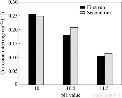 Fig. 6 Corrosion (dissolution) rates of RGO at scan rate of 0.166 mV/s and different pH values (10.5-11.5) in 0.04 mol/L NaCN electrolyte at 100 r/min agitation in duplicates (first run and second run)