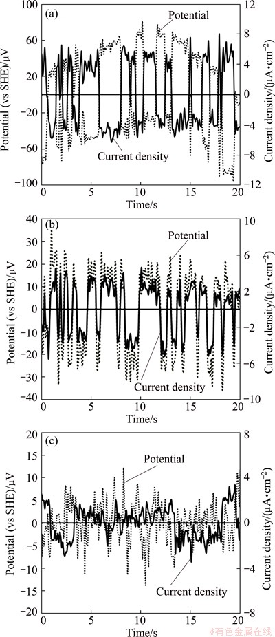 Fig. 11 Potential noise and current noise for two polarized gold electrodes under potentiostaic conditions applying one active potential of 0.3 V (a) and two passive potentials of 1 V (b) and 1.4 V (c) immersed in 0.04 mol/L NaCN solution after 16 h
