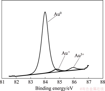 The chemical characterization of gold surface was performed to provide an insight into the surface reaction processes. The XPS study was carried out after 30 min cathodic cleaning at -0.8 V, followed by potentio- dynamic test at a scan rate of 0.166 mV/s between -0.8 and 1 V and finally potentiostatic test for 2 h in 0.1 mol/L NaCN solution at 1 V and 25 °C with argon bubbling and magnetic stirring of 100 r/min. The XPS studies show the presence of Au+ and Au3+ oxides on the surface of gold electrode (Fig. 12). It is believed that oxides promote the passivation of gold surface [12,29]. Due to rapid reactions during leaching, the detecting of oxides is highly sensitive. Although the presence of oxides can be identified according to two very slight peaks, a standard conventional peak as observed in sulfuric acid medium. This can be mainly attributed to the examined cyanide concentration (0.1 mol/L). This finding highlights that passivation is more likely to be caused by corrosion products than real passivation. The XPS studies on gold surface confirm that there is a kind of partial passivation due to corrosion products.