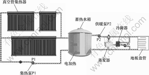 该系统有3种运行工况:(1) 太阳能直接供暖; (2) 太阳能与热泵联合供暖;(3) 热泵单独供暖。