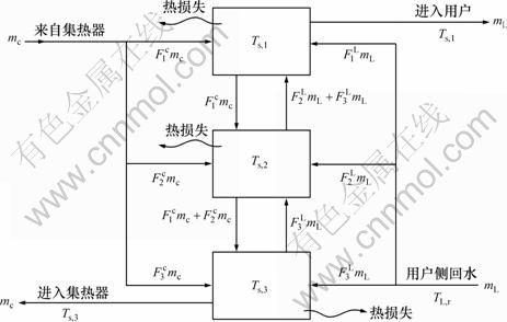 储水箱中的每个节点的热量平衡包括从太阳能集热器获得的热量、通过水箱壁散失到环境中的热损失、承担的室内热负荷以及自身增加的显热。热量平衡方程如下:
