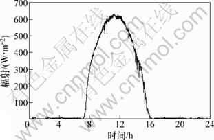 在2009年采暖季对非直膨式太阳能热泵实验台进行了实验,获得了室外气象参数等基础数据。下面以2009年12月15日为例,对实验台进行模拟研究。该日室外温度和太阳能辐射强度变化情况如图3和图4所示。