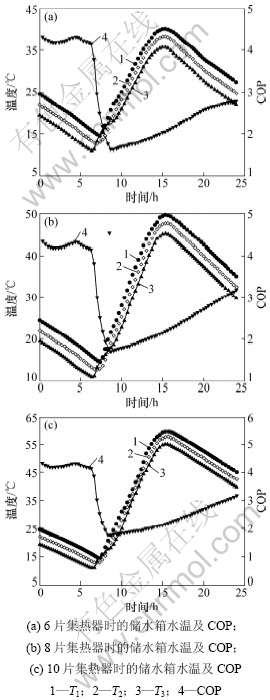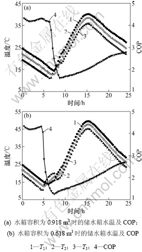 储水箱在系统中起着举足轻重的作用,它既是储能设备又是耗能装置。储水箱的容积影响着储水箱的温度,进而影响太阳能集热器以及热泵的效率,从而影响整个系统的性能COP。图6所示是不同储水箱容积的系统在典型日的水箱温度以及系统COP的变化曲线。