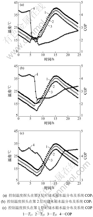 图7 不同控制温度探头位置下储水箱水温分布及系统COP
