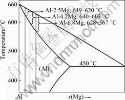 Fig.1 shows the solid-liquid zone of Al-Mg alloys with various Mg contents. It is indicated that the semi-solid temperature ranges of Al-2.5Mg, Al-4.2Mg and Al-6.8Mg alloys are 649-620 °C, 640-603 °C and 628-567 °C, respectively.