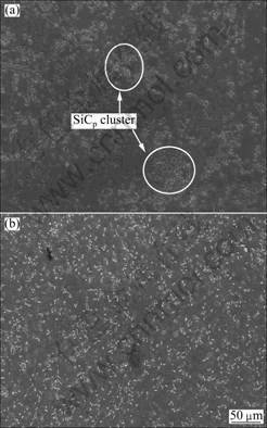 solid-liquid range) with the same stirring speed of 500 r/min and time of 30 min. It can be seen from Fig.2(a) that SiC particles agglomerate obviously in composites fabricated at stirring temperature of 650 °C. In contrast, SiC particles distribute homogeneously in the composites fabricated at 612 °C (Fig.2(b)). This is due to the lower viscosity and friction resistance of the melt at the temperature of 650 °C, and thus the friction between reinforcement and matrix is decreased. In this case, it is difficult to disperse SiC particles homogenously in the matrix. However, when the melt temperature is decreased to the semi-solid range of 612 °C, the semi-solid slurry owns a higher viscosity, but maintains a better liquidity at stirring speed of 500 r/min. The vortex generated in the stirring process smashes the solid dendrite in semi-solid slurry, which further improves the distribution of reinforcement in the matrix by enhancing the friction between reinforcement and matrix. However, when the stirring temperature is too low, the solid fraction in the semi-solid slurry increases and liquid viscosity rises rapidly, which probably makes it difficult to carry out the stirring process[7].