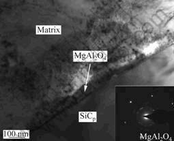 In semi-solid stirring process of SiC/Al composites above 650 °C, SiC particles tend to react with aluminum, leading to the formation of Al4C3 and Si[10]. Fig.3 shows the XRD result of the 10% SiCp/Al-2.5Mg composite. It can be seen that only Al, SiC, MgO and MgAl2O4 exist in the prepared composite and no reflections corresponding to Al4C3 are observed. Fig.4 shows the TEM micrograph of the 10% SiCp/Al-2.5Mg composite and diffraction pattern of MgAl2O4. It testifies that MgAl2O4 layer appears on SiCp surface. The same result is also obtained for 10% SiCp/Al-4.2Mg and 10% SiCp/Al-6.8Mg composites. The appearance of MgAl2O4 layer is related to SiO2 on SiC surface, which is formed during calcinations of SiC particles in air[9]. The SiO2 layer also restricts the reaction between Al and SiC. During the stirring process, Al reacts with SiO2 to form Al2O3 through the following reaction: