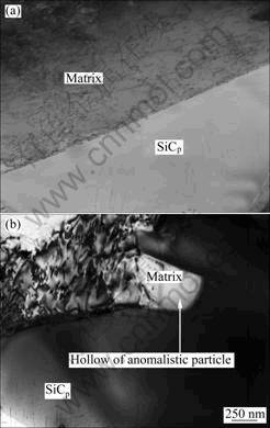 Fig.6 shows the TEM micrographs of 10% SiCp/Al-Mg composites. Fig.6(a) shows that porosity is not observed at the interface between particles and Al-4.2Mg matrix, and SiC particles are almost perfectly embedded inside the Al-4.2Mg matrix without any interface debonding. Fig.6(b) shows that there is no porosity in the hollow of anomalistic particles due to the better wettability between SiC particles and Al-6.8Mg matrix. This indicates that the matrix can flow into the hollow of anomalistic particles and a good interfacial bonding is formed during the solidification.