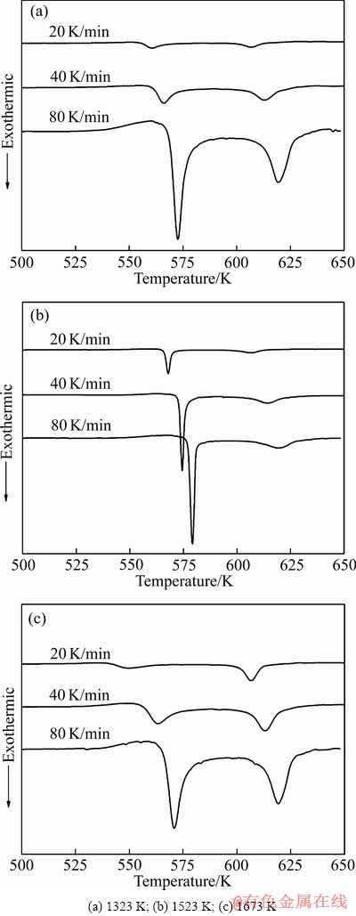 为了进一步探索熔体温度对Al85Ni5Y8Co2非晶薄带晶化行为的影响,对不同熔体温度制备的非晶薄带进行了不同速率的DSC试验。图4所示为不同熔体温度制备的Al85Ni5Y8Co2非晶薄带在20、40和80 K/min的升温速率下的DSC曲线。通过比较图4的DSC曲线,可以方便地找出Al85Ni5Y8Co2非晶的晶化特征温度值。